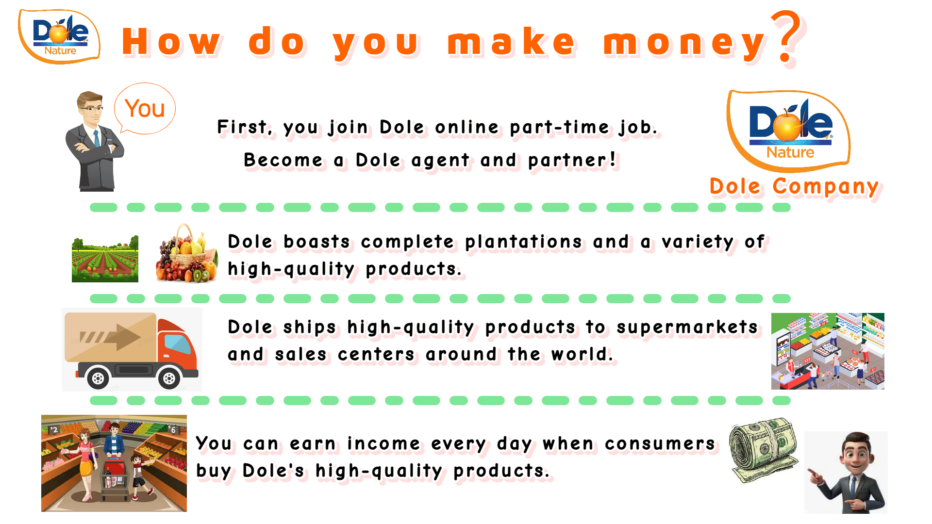 1.First, you join Dole online part-time job.Become a Dole agent and partner!